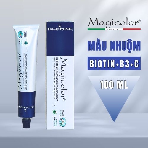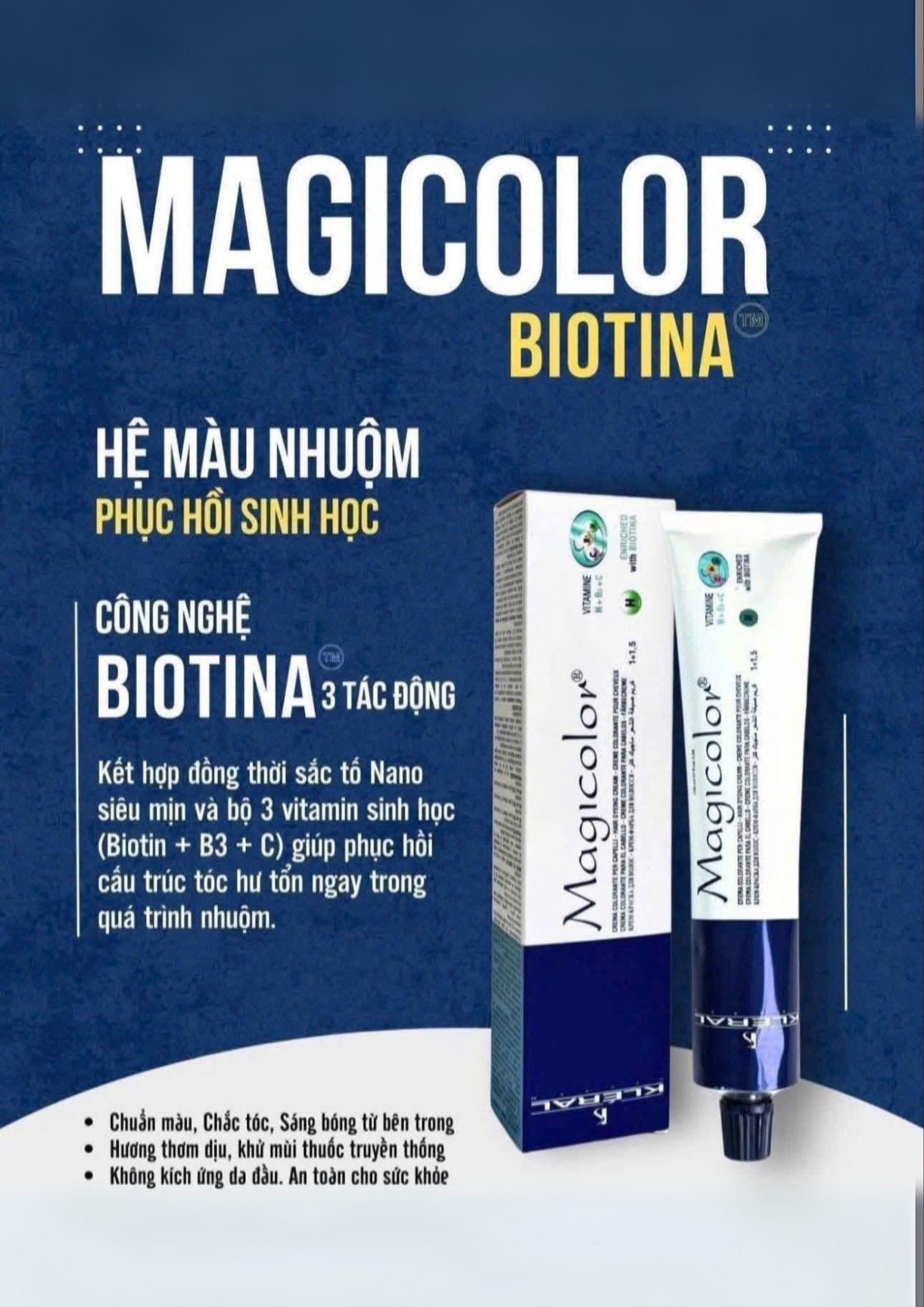 Magicolor – Biotina là màu nhuộm sinh học thế hệ mới với công nghệ Biotina 3 tác động, hạt màu Nano siêu mịn và bộ 3 vitamin (Biotin + B3 + C). Giúp phục hồi tóc hư tổn ngay khi nhuộm, giảm mùi hóa chất, an toàn cho da đầu và sức khỏe.